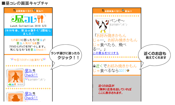 「昼コレ」は、ケータイ向けの無料サービスで、「お昼に何を食べようかな?」と迷った時や、「料理を作るのが面倒くさい」時等に、ワンクリックで選択したキャラクターが、お昼ごはんのメニューを勝手に決めてくれるサービスです。GPSケータイの場合には、近くの飲食店やスーパー、コンビニ等をレコメンドしてくれる機能もあります。