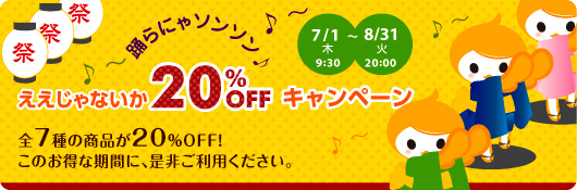 P-NET(ピーネット)の『踊らにゃソンソン♪ ええじゃないか20%OFFキャンペーン』[http://p-net.com/html/ichioshi.html]は、同社の製品の中でも既存顧客からのリピートが多い製品・サイズを対象に価格割引を実施するキャンペーンです。7月・8月は夏季のイベントに最適な人気商品を割引提供し、より多くのニーズに応えるとともに、より幅広いラインナップをお試しいただくことができます。