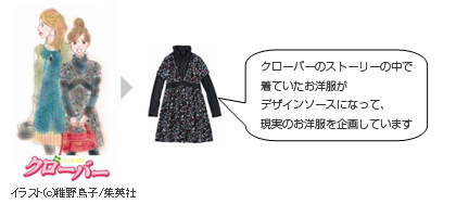 『クローバー』ファンのプランナーが、作品の中で主人公(沙耶:ホテル会社勤務のOL)が着こなしているファッションを題材にして、作者である稚野鳥子さんと一緒に、オフィスでも着られるワンピースを企画しました。スタイリングされたコーディネートのセットと、稚野先生書き下ろしのイラストやメッセージが書かれたカードが届きます。