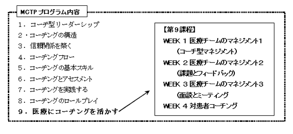 MCTPは、チームのコミュニケーションを向上させることにより組織力を向上させ、その結果、医師や看護師の離職防止、チーム医療向上、患者満足度向上といった効果を生み出すプログラムです。このプログラムは、当社のリーダーシップ開発プログラム、「コーポレート・コーチ・トレーニング・プログラム(CCTP)」の8課程と、医療従事者専用モジュール(第9課程)で構成されています。この第9課程は、医療チームをマネジメントする際に必要とされるマネジャーとしてのマインド、医療現場でコーチングが有効な場面とそこで活用できるスキルの紹介、また、多くのエクササイズなどで構成されています。第9課程のマニュアルは、コーチ資格をもった臨床現場の医療従事者のチームが執筆。クラス運営もそれらの医療従事者によって行われます。