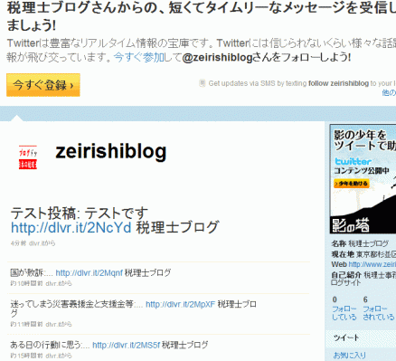 同社によると、「税理士ブログのツイッターも今月初めに開設済みで、ブログのRSS配信で掲載しております」 http://twitter.com/zeirishiblog