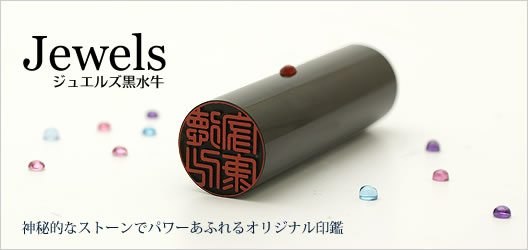 新商品『ジュエルズ黒水牛』は、高品質な黒水牛印鑑の、上下を示す「あたり」の部分に神秘的な貴石・宝石を埋め込みました。