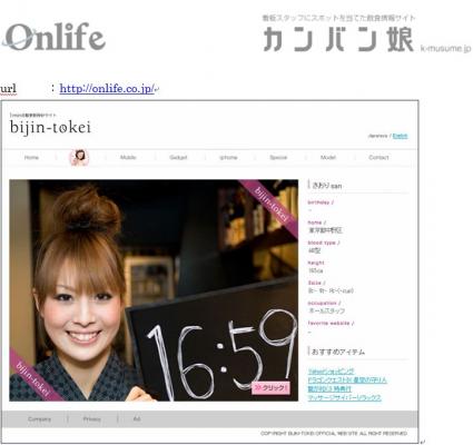 美人時計の運営するアプリケーションサイト『美人時計』(http://www.bijint.com/)と、オンライフの運営する飲食情報サイト『カンバン娘』(http://k-musume.jp/)とのコンテンツを融合させ、『カンバン娘時計(仮称)』のコンテンツ・アプリケーション開発を共同で進めて参ります。