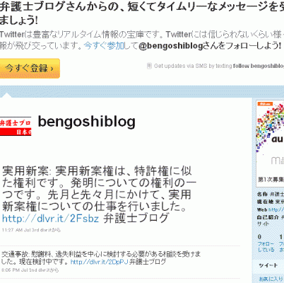 同社によると、「弁護士ブログのツイッターも今月初めに開設済みで、ブログのRSS配信で掲載しております」 http://twitter.com/bengoshiblog