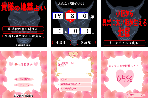 『貴様の地獄占い』は、生年月日を入力することで、ユーザーにどのような地獄がやってくるかを占う、メーカー系コンテンツです。「小指から異常に太い毛が生える地獄」「常に服がチクチクする地獄」など、思わず笑ってしまう結果が表示されるので、友達と集まった時の盛り上げツールやブログのネタとしてオススメです。