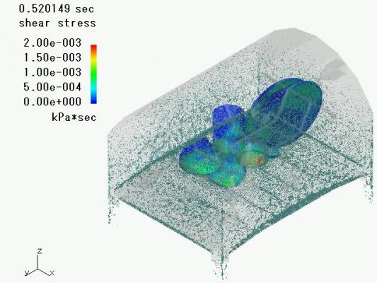今回、新たにクラスタ対応版を追加し、多くの計算時間を必要とする大規模モデル解析をこれまでの5分の1以下の時間で計算することを可能とした。特に、ギア攪拌、自動車部品内の油面挙動解析など、モデルが大きくかつ詳細な流れを表現する必要のある解析では大きな威力を発揮することが期待される。また、ソルバーのクラスタ対応と併せ、プリプロセッサ、ポストプロセッサも大規模モデルに対応すべく改良を行い、数百万以上の粒子モデルを取り扱うことが可能となった。