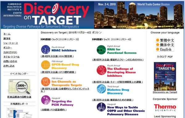 株式会社グローバル インフォメーションでは、皆様の利便性を図る為に、日本語、英語、韓国語、中国語で「Discovery on Target 2010」の情報を提供するとともに、会議の参加のお申し込みを承っております。