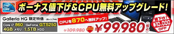 本キャンペーンは、人気のゲームパソコン「Prime Galleria HG」など、対象となるインテル(R) Core(TM) i7-860 プロセッサー搭載パソコンをお買い上げ時に、インテル(R) Core(TM) i7-870 プロセッサーに無償でアップグレードいたします(※)。