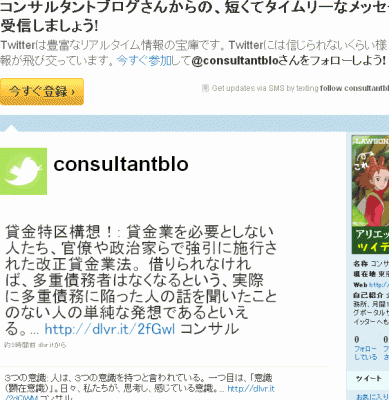 同社によると、「コンサルタントブログのツイッ ターも今週開設済みで、ブログのRSS配信で掲載しております」 http://twitter.com/consultantblo