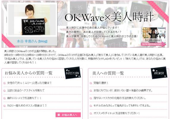 美人が1分ごとに時間を知らせてくれるウェブサイト「美人時計」を運営する株式会社美人時計(東京都港区、代表:田中慎也)とQ&Aサイト「OKWave」を運営する株式会社オウケイウェイヴ(本社:東京都渋谷区、代表取締役社長:兼元謙任)は、2010年7月15日より、美人とQ&Aできるコラボ企画『お悩み美人』『教えて美人』を開始しました。