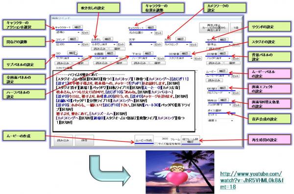 操作はいたって簡単で、編集画面よりプルダウンでコマンドをセットし、セリフを入力していくだけで動画コンテンツが生成されます。