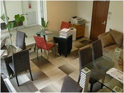 店舗前面はガラス張りになっており、物件情報等で店内を隠さず、外から店内の様子が良く分かる、明るい雰囲気が特徴です。ラタン、ベロア地のチェアーや4人掛けソファなどが配置され、物件情報やファイルが見当たらない空間は、まるでインテリアショップのモデルハウスやオシャレなカフェを彷彿とさせます。