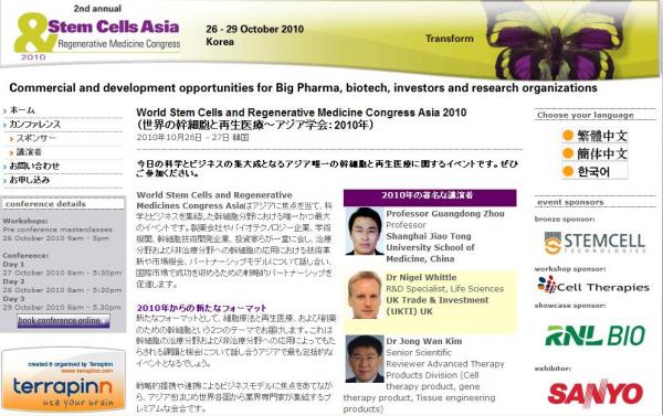会議:「World Stem Cells and Regenerative Medicine Congress Asia 2010 (世界の幹細胞と再生医療~アジア学会:2010年」