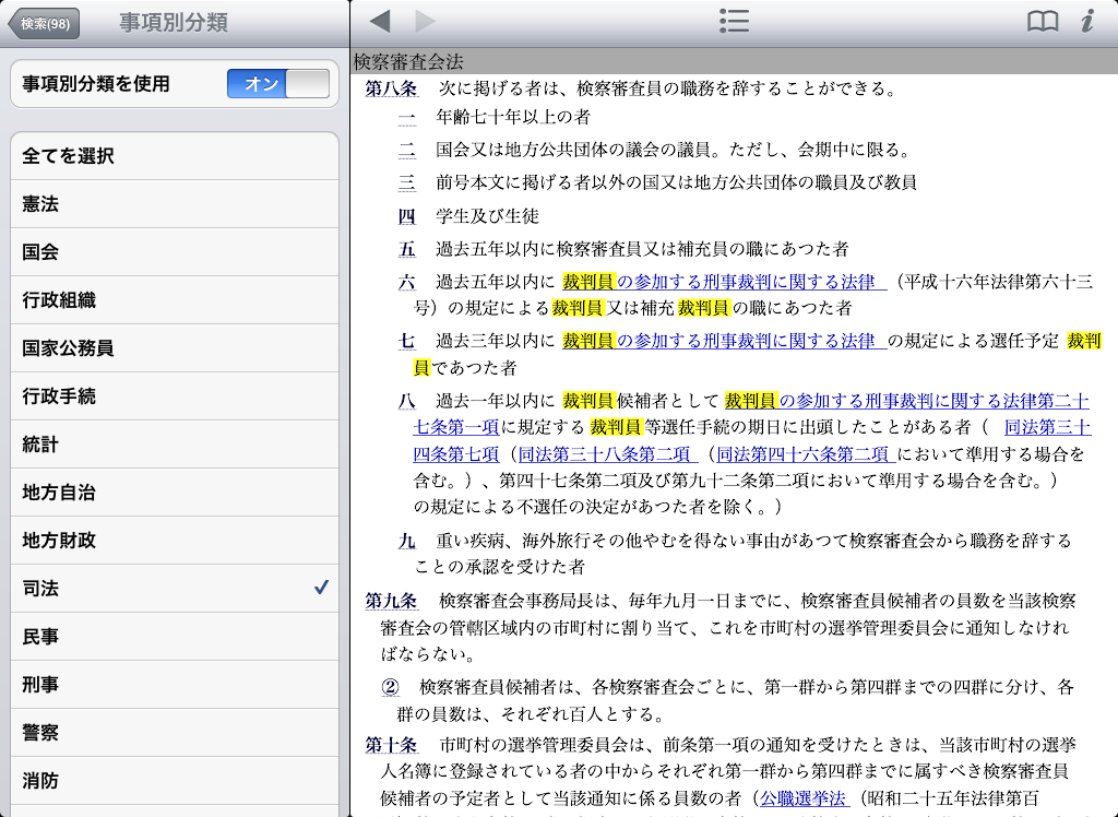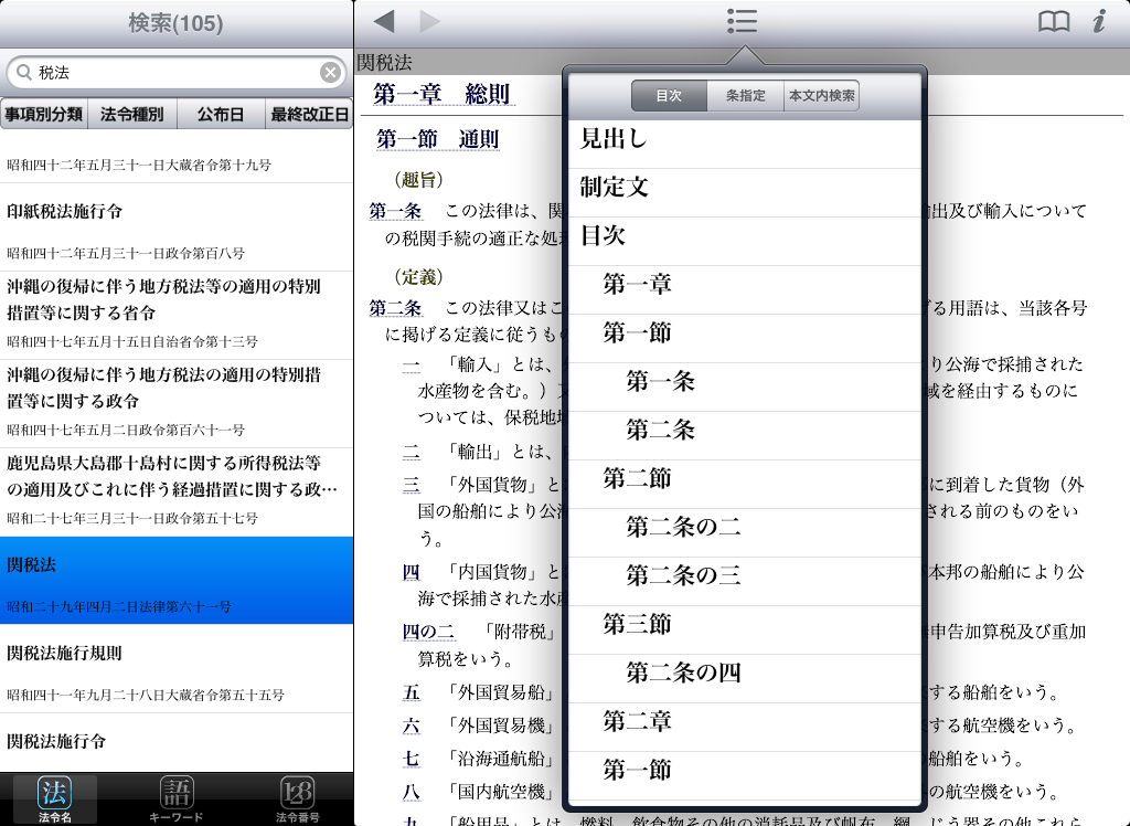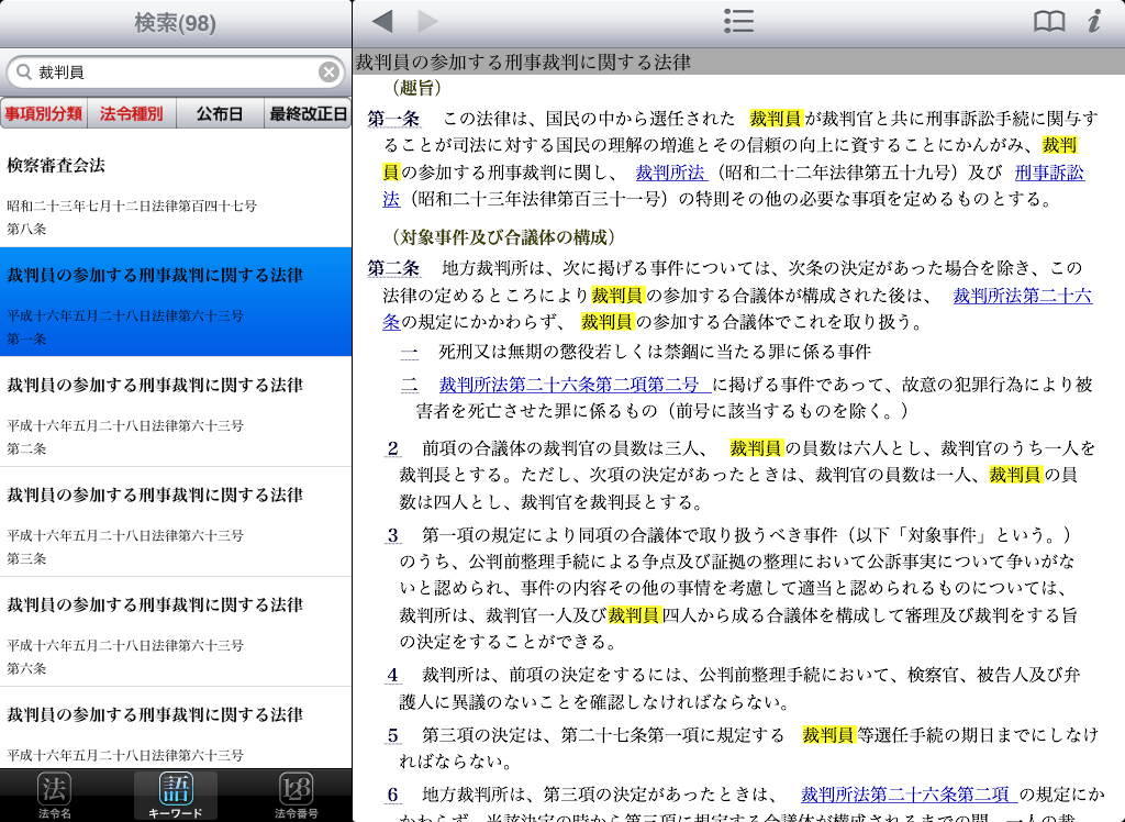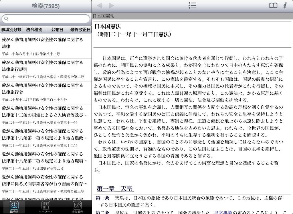 本製品は、六法を始め現行の約7,500すべての法令(憲法・法律・政令・勅令・府令・省令)をiPad上で簡単に検索・閲覧できる法曹実務家のためのソフトウェアです。iPadがあれば、もう重い書籍を持ち歩く必要はありません。データはすべてiPadに格納されますので、常時Wi-Fiや3Gに接続していなくても利用できます。