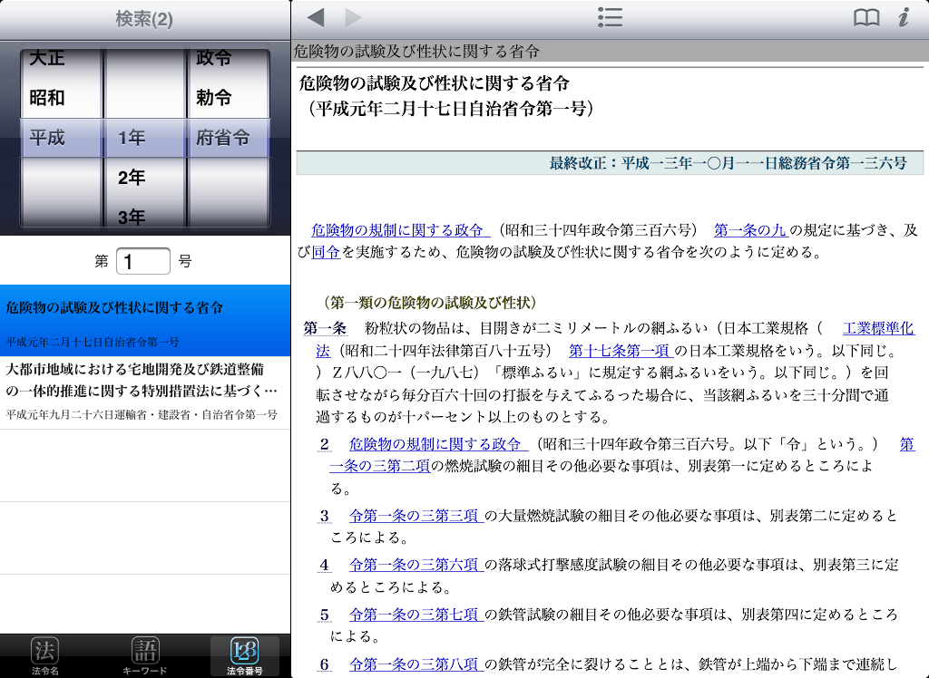 法令データは総務省が公開したデータを参照。法令名中の用語検索や、法令番号からの検索、条文中に該当の用語を含む法令を検索でき、正式な法令名がわからない時でも目的の法令を簡単に見つけることができます。