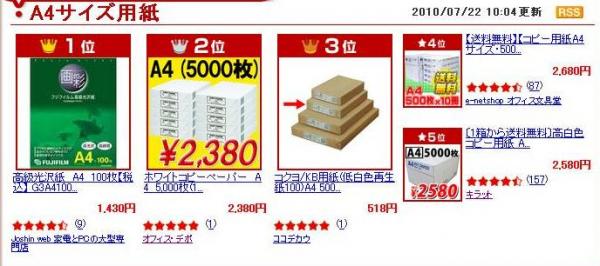 お蔭様で楽天市場の「OA用紙A4サイズ」部門で第2位にランキングされました。(2010/7/22付け)