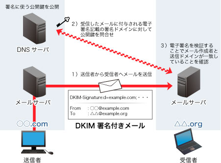 「DKIM」は、受信したメールに付与される電子署名記載の署名ドメインに対して公開鍵を問い合わせ、電子署名を検証することでメール作成者と送信ドメインが一致していることを確認する技術です。
