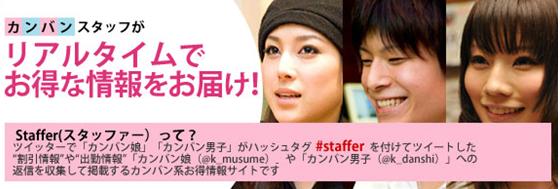飲食店のスタッフが、ツイッターにてハッシュタグ#staffer (※1)を付けてツイート(投函)することで、割引情報などの店舗情報を収集し掲載するサイトとなっております。