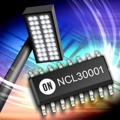 NCL30001は電力要件が40 Wから150 Wのデザインに理想的で、連続導通モード(CCM)で動作するように設計されており、定電流または固定出力電圧ドライバとして構成できます。SOIC-16パッケージに収納されたコントローラは、20 kHz~250 kHzの可変動作周波数および高温シャットダウン回路を実装可能な多機能ラッチオフ・ピンを備えており、回路設計者に高い柔軟性を提供します。