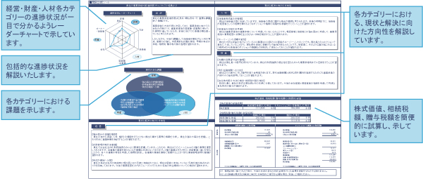 ○ 自社株の評価や相続税対策に偏りがちであった事業承継対策について、人材、経営、財産という3つの観点からチェックし、課題を包括的に診断します。