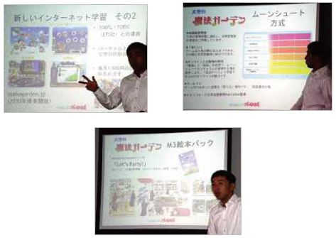 様々な企業・団体による研究が発表される中、ムーンシュート代表加藤幸二氏の研究テーマは「テクノロジーを活用し幼児期の英語学習環境を最適化」。2011年度より小学校(5、6年生)で必修化となる英語活動を見据えた幼児期から始める英語学習ソリューションについての研究発表となった。