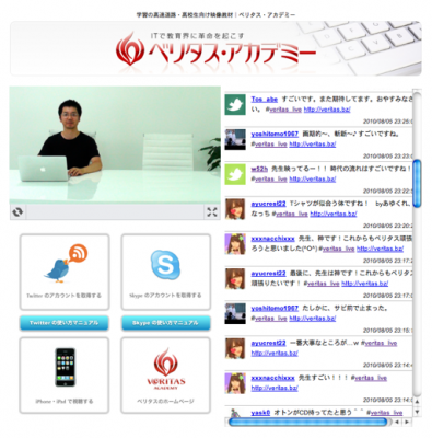 ベリタス・アカデミーでは、電子ホワイトボードを活用し、授業効率を高めた有名予備校講師による映像授業を、全国の学習塾向けに販売し、通塾生が塾でも自宅でも毎日好きなだけ月額定額で受講できるパソコン、iPhone, iPad 向けの配信サービスを提供してきました。今回ユーストリームとツイッターを組み合わせたライブ配信を加えることで、学習者は直接ツイッターで講師に質問することができたり、全国の学習者がリアルタイムに同じ場を共有して刺激を与え合うことができるようになります。