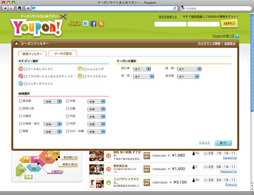 「ユーポン(Youpon.jp)」は、日本国内に多数存在するグルーポン型フラッシュマーケティングサイトにて開催中のクーポン情報を、独自クローラー技術により収集。