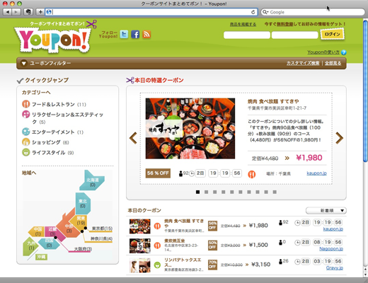 「ユーポン(Youpon.jp)」は、日本国内に多数存在するグルーポン型フラッシュマーケティングサイトにて開催中のクーポン情報を、独自クローラー技術により収集。