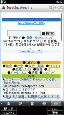 サービス内容:TwitterでURLが含まれているつぶやきを抽出して人気順に表示する、Twitterでいま話題のサイトがわかるサービス。つぶやきに含まれているWebページをカテゴリー別にランキング形式で確認できます。