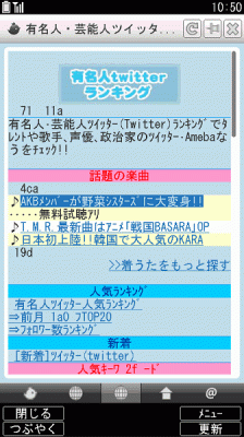 サービス内容 :芸能人・有名人のTwitterとAmebaなう利用者をランキング形式で紹介するサービス。芸能人・有名人の人気度のチェックや検索に役立ちます。