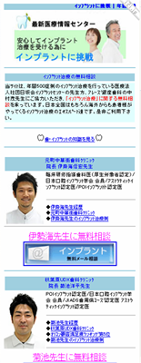 yahoo mobile 検索エンジンにて1位(キーワード:インプラント)の「インプラントに挑戦(http://www.implant-zyoho.com/i/)」において、インプラントの年間症例数が500件以上ある日坂会インプラントセンターの先生方にご協力いただき、「インプラント治療」に関する無料相談を承ることに致しました。