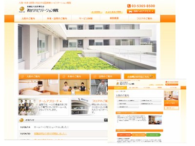 また、先に公開した船橋市立リハビリテーション病院のWebサイトとイメージの統一を図りつつも、オレンジ色の色彩やオリジナルのコンテンツ「輝NET」にて差別化をしています。また、「フロアのご案内」では、様々な種類がある各病室・施設の写真を多数掲載しています。