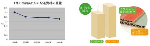 株式会社フェリシモでは、2009年度のお客さまへのお届け1件あたりに使用する配送資材の重量を、計測基準を設定した2005年から比較して約24%削減しました。