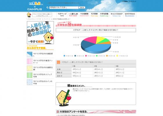 各大学別に、一人暮らし大学生のお部屋取材を行い、今後一人暮らしを検討しているユーザーに、先輩大学生のリアルな生活感を伝えるとともに、お部屋探し・一人暮らしに関するアドバイスなどを掲載しています。