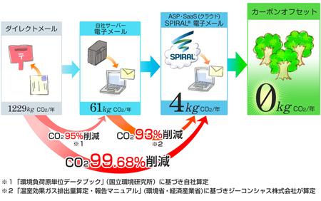 ASP・SaaS(クラウド)を利用することにより、ユーザーが個別にサーバー・ネットワーク機器類を設置・運用する場合と比べて、社会全体としての CO2排出量は大幅に削減されます。例えば、郵送ダイレクトメールを「スパイラル(R)」で電子メール化した場合には99.68%ものCO2削減効果を見込めます。なお、「スパイラル(R)」は2010年4月に中国遼寧省の風力発電プロジェクトによるCO2削減活動に参加しており、当社サービスの利活用に伴う CO2排出量は100%オフセットされています。