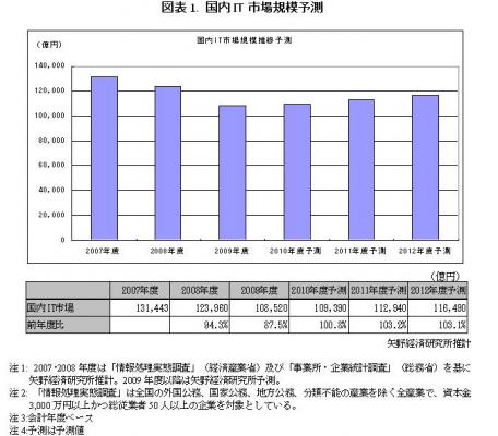 国内民間企業のIT市場規模(ハード・ソフト・サービス含む)は、2007年度は13兆1,443億円であり、2008年度は5.7%減となる12兆3,960億円、2009年度は前年度比12.5%減となる10兆8,520億円と推計した。
