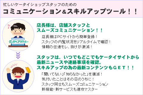 「ケータイアカデミー」は、当日の出来事や売り上げ報告等を簡単に一括して登録スタッフ全員のケータイに送ることが出来ます。また、携帯業界ならではの、週中に施策が決まり、週末にはキャンペーンを実施するといったような急なキャリア施策の変更、新サービスの開始等が起きた場合でも、メールやお知らせ送信を活用することでスムーズに連絡を回し、スタッフをバックアップすることが可能です。その上、開封確認も実装していることから、本部(ショップ管理担当)や現場の店長が容易に確認できるようになっております。