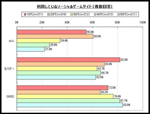 「利用しているソーシャルゲームサイト」について年代別で比べたところ、10代~20代はモバゲータウンの利用率がもっとも高かったのに対し、30代~50代はGREEがもっとも高い結果となった。また、mixiについては30代以降で利用率が低くなっており、20代の60.6%に対して50代では21.8%と約40ポイントの差が見られた。