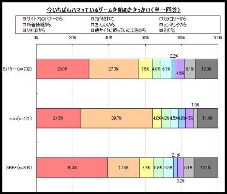 ■今いちばんハマっているゲームを始めたきっかけは、モバゲータウン・GREEは「サイト内のバナーから」、mixiは「招待されて」