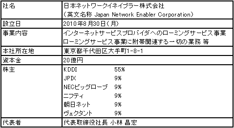 この合意に基づき、6社は、共同で事業を推進する新会社「日本ネットワークイネイブラー株式会社」(以下「JPNE」)を設立しました。新会社は、2010年2月にKDDIおよびJPIXが設立した「ブロードバンドアクセスエクスチェンジ企画株式会社」が実施した第三者割当増資に6社が応じ、2010年8月30日(月)の同社株主総会決議を経て、事業会社として社名変更したものです。