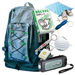 レインコート、三徳ナイフ、FMラジオ等のグッズをデイパックに