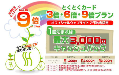 詳細:公式ホームページからの予約画面より、『とくとくカード3倍プラン』『とくとくカード6倍プラン』『とくとくカード9倍プラン』でご予約した場合のみ、それぞれ3個、6個、9個スタンプを捺印いたします。スタンプ3個で1,000円のキャッシュバックで、次回ご宿泊時にご利用いただけます。