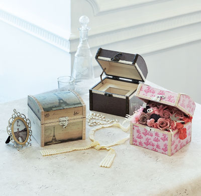 アンティークな海賊の宝箱をイメージした木箱の登場です。シャビーな留め金やゴージャスなレースリボン仕上げ。フタの角度を調整できるヒンジ付。アレンジルームの高さも十分とっているので、フタをあけて作る溢れるようなアレンジでも、フタを閉められるアレンジでも2タイプで楽しめます。ウィリアム・モリスをオマージュしたシックな「モリス」、フレンチアンティークな「パリス」、貴族の暮らしをイメージした壁紙風の「アリスト」。3つのクラシックなデザインをお楽しみ下さい。