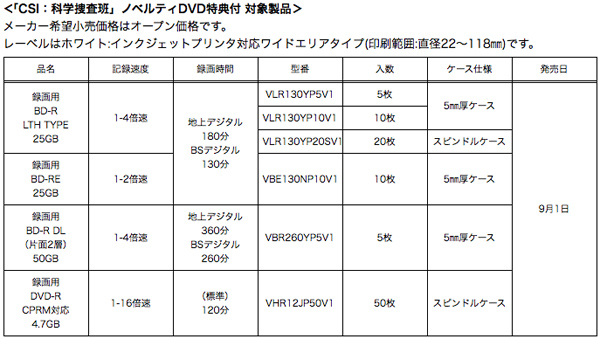 さらに、記録型光ディスクでブランド別世界シェアNo.1※2のバーベイタムにちなみ、海外ドラマ専門チャンネルAXNの協力により、視聴者数世界 No.1※1テレビドラマ「CSI:科学捜査班」のノベルティDVD(非売品)を同梱したキャンペーンパック製品※3を9月1日から発売します※4。この ノベルティDVDは、アカデミー賞の受賞経験を持つ米映画監督クエンティン・タランティーノ氏が原案と監督を手がけた放送回「CSI:“12時間”の死 闘」の前・後編2話※5とプロモーション映像を収録しています。また、このキャンペーンのテレビCMを「CSI:」全3シリーズを放送するAXNで展開し ます。