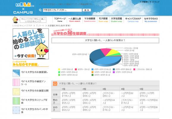 各大学別に、一人暮らし大学生のお部屋取材を行い、今後一人暮らしを検討しているユーザーに、先輩大学生のリアルな生活感を伝えるとともに、お部屋探し・一人暮らしに関するアドバイスなどを掲載しています。