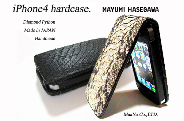 このレザーハードケースは、iPhone4を縦に入れる(縦開き)ブック型タイプで、表面は蛇革(ダイヤモンドパイソン)。