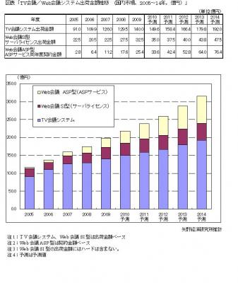 2010年の国内TV会議システム市場は、不況下でも問い合わせ件数が増えている。要因としては新規需要のほか、追加需要や更新需要が増えていることがある。今後も出荷金額は前年比110%弱で堅実に成長を続けていき、2014年には192億円に到達すると予測する。
