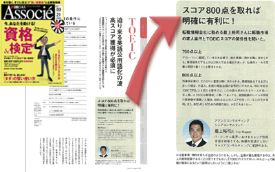 人材紹介会社で転職支援サービスを提供しているアクシスコンサルティング株式会社(代表取締役社長:山尾幸弘 本社:東京都千代田区)のキャリアコンサルタント最上が、Associe(2010年9月21日号)『TOEIC 迫り来る英語公用化の波 高スコア獲得が必須に』のインタビュー記事に掲載されました!