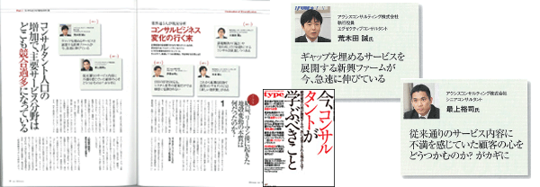 人材紹介会社で転職支援サービスを提供しているアクシスコンサルティング株式会社(代表取締役社長:山尾幸弘 本社:東京都千代田区)のキャリアコンサルタント荒木田と最上が、Type(2010年9月7日号)『コンサルビジネス変化の行く末』に現状分析の論客として掲載されました!