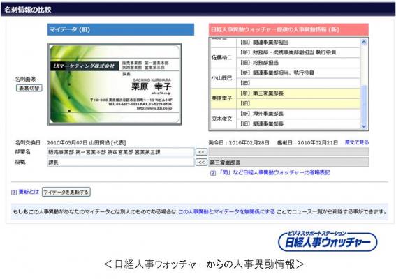 Link Knowledge には人事異動情報や所有する名刺の企業に関するニュースを自動で提供する機能があります。昇進のお知らせやオフィス移転のニュースをリアルタイムに入手し、お客様の名刺データを簡単に変更できます。この機能によって上記の問題を解決し、常に最新の顧客情報を保持していきます。